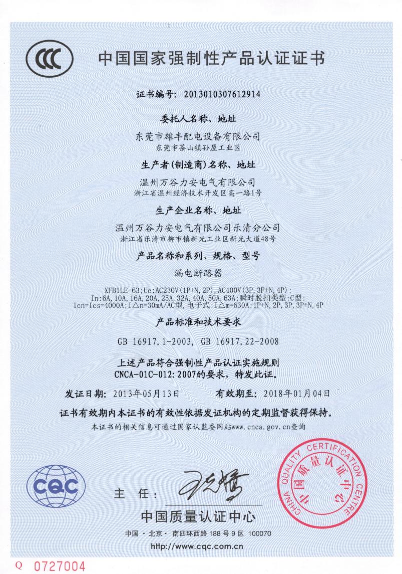 低壓小型漏電斷路器“3C”認(rèn)證