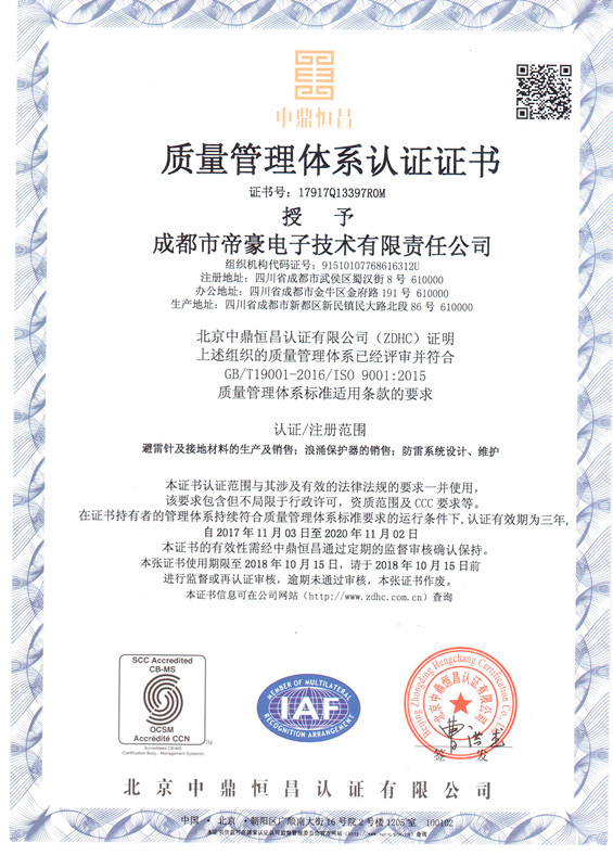 成都市帝豪電子技術(shù)有限責(zé)任公司-于2004年11月成立,總部設(shè)在四川成都。十年勵(lì)精圖治,奮發(fā)圖強(qiáng),帝豪防雷現(xiàn)已榮獲ISO9001-2008國(guó)際質(zhì)量管理體系認(rèn)證,質(zhì)量、服務(wù)、信譽(yù)AAA企業(yè)稱號(hào),并獲得多項(xiàng)外觀專利及實(shí)用新型專利,是國(guó)內(nèi)較早提出五年質(zhì)保防雷企業(yè)。成都市帝豪電子技術(shù)有限責(zé)任公司按照服務(wù)社會(huì)、造福人類的企業(yè)宗旨,貫徹務(wù)實(shí)創(chuàng)新、凝聚奉獻(xiàn)的企業(yè)理念,勤勤懇懇做事,踏踏實(shí)實(shí)做人的企業(yè)風(fēng)格,經(jīng)過(guò)全體員工的努力,現(xiàn)以立足于雷電電磁脈沖綜合防護(hù)、過(guò)電壓防護(hù)、接地保護(hù)、電磁屏蔽領(lǐng)域,集防雷產(chǎn)品研發(fā)、生產(chǎn)、銷售與防雷工程勘測(cè)、設(shè)計(jì)、施工、維護(hù)為一體,擁有自主知識(shí)產(chǎn)權(quán)的專業(yè)化高新技術(shù)企業(yè)。以引領(lǐng)行業(yè)標(biāo)準(zhǔn)的專業(yè)化工程設(shè)計(jì)、實(shí)施及服務(wù)能力面向多領(lǐng)域用戶,提供一體化解決方案。 公司生產(chǎn)的電源避雷器、信號(hào)避雷器、天饋避雷器、避雷針及接地五大系列200余款產(chǎn)品廣泛應(yīng)用于通信、氣象、金融、廣播電視、電力、航天航點(diǎn)擊查看