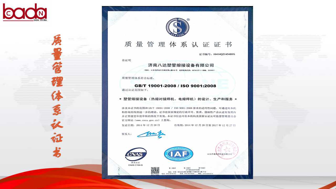 濟(jì)南八達(dá)塑管熔接設(shè)備有限公司專業(yè)生產(chǎn)、銷售“八達(dá)”品牌的熱熔對接焊機(jī)、全自動(dòng)熱熔對接焊機(jī)、管件熱熔對接焊機(jī)、馬鞍形異徑熱熔對接焊機(jī)、塑料管道多角度切割鋸、電熔焊機(jī)、手持承插焊機(jī)、以及各種施工專用輔助工具等多種型號(hào)和系列的產(chǎn)品。產(chǎn)品被國內(nèi)各管材、管件生產(chǎn)廠家、自來水公司、燃?xì)夤尽I(yè)施工單位等廣泛使用,并以其優(yōu)秀的性價(jià)比和可靠的質(zhì)量贏得了市場的廣泛青睞。點(diǎn)擊查看
