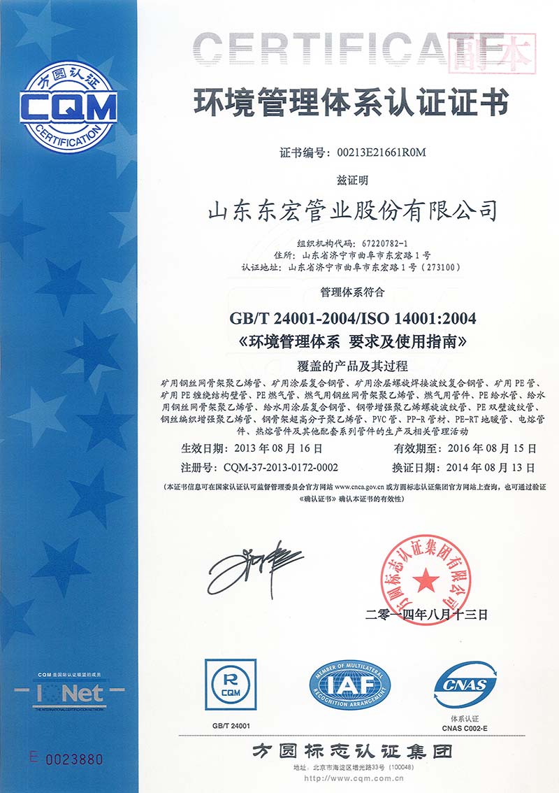 山東東宏管業(yè)股份有限公司單位性質(zhì)是股份有限公司(非上市、自然人投資或控股),成立于2008年1月21日(原山東東宏管業(yè)有限公司,2013年12月9日更名),是山東東宏集團(tuán)有限公司(原成立于1997年8月4日的曲阜市東宏實(shí)業(yè)有限公司)的控股子公司,秉承了集團(tuán)公司的企業(yè)文化及生產(chǎn)理念,是目前國(guó)內(nèi)專(zhuān)業(yè)生產(chǎn)礦用、瓦斯抽放用、燃?xì)庥?、油田用、電力工業(yè)用、基礎(chǔ)設(shè)施用、民用管材及各種配套管件系列產(chǎn)品的大型塑料管材生產(chǎn)基地。山東東宏管業(yè)股份有限公司主要產(chǎn)品有:鋼絲網(wǎng)骨架聚乙烯復(fù)合管、PE給排水管、給水用聚乙烯(環(huán)氧樹(shù)脂)涂層復(fù)合鋼管、PE礦用管、礦用聚乙烯(環(huán)氧樹(shù)脂)涂層復(fù)合鋼管、礦用聚乙烯(環(huán)氧樹(shù)脂)涂層螺旋焊接波紋復(fù)合鋼管、礦用PE纏繞結(jié)構(gòu)壁管、礦用鋼絲編織增強(qiáng)聚乙烯復(fù)合管、PE燃?xì)夤堋IP增強(qiáng)熱塑性塑料復(fù)合管、PE鋼帶增強(qiáng)螺旋波紋管、PP-R管、PP-R塑鋁穩(wěn)態(tài)管、PE-RT地暖管、PE超高耐磨管、鋼絲編織增強(qiáng)PE管、高壓橡膠管、雙點(diǎn)擊查看