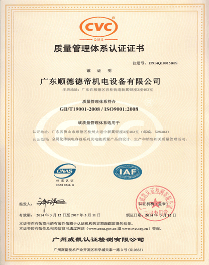 廣東順德德帝機(jī)電設(shè)備有限公司,是一家集研發(fā)、制造、銷售為一體的金屬化薄膜電容器及電能質(zhì)量?jī)?yōu)化產(chǎn)品的專業(yè)廠商,企業(yè)建立了完整的質(zhì)量管理體系,并通過(guò)了ISO9001:2008質(zhì)量管理體系認(rèn)證。 廣東順德德帝機(jī)電設(shè)備有限公司,率先引進(jìn)國(guó)內(nèi)外較為先進(jìn)的設(shè)備,采用優(yōu)質(zhì)的材料,不斷提高和完善產(chǎn)品的加工工藝,公司的所有產(chǎn)品嚴(yán)格按照國(guó)家標(biāo)準(zhǔn)及相應(yīng)的國(guó)際標(biāo)準(zhǔn)來(lái)生產(chǎn),并有完善的檢測(cè)手段和齊全的試驗(yàn)設(shè)備,始終如一地把保證和提高產(chǎn)品質(zhì)量放在企業(yè)發(fā)展的首位,公司可以根據(jù)不同的用途、不同的使用環(huán)境進(jìn)行完美的設(shè)計(jì)和制造,來(lái)滿足不同廠家的需要。 本公司生產(chǎn)的自愈式金屬化薄膜電容器、智能電容器、串聯(lián)電抗器,廣泛應(yīng)用于電力和電源系統(tǒng)中,其中BKMJ系列產(chǎn)品的防爆和永不燃燒技術(shù)科技含量高,獲得國(guó)際專利,專利號(hào)為ZL2013 0544974.7。 電能質(zhì)量?jī)?yōu)化產(chǎn)品:無(wú)功補(bǔ)償控制器、晶閘管調(diào)節(jié)模塊、智能濾波補(bǔ)償模塊、設(shè)備級(jí)濾波器、低壓線點(diǎn)擊查看