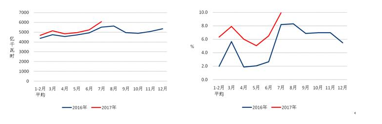 圖1 2016、2017年分月全社會(huì)用電量及其增速