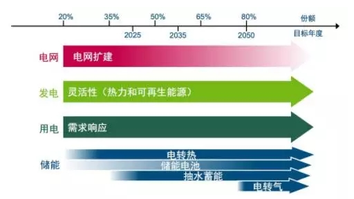 反觀另一個新能源發(fā)展大國德國,2016年可再生能源發(fā)電量占比已經(jīng)超過了32%,在某些日子里可再生能源甚至能夠覆蓋約90%的電力消耗。在如此高的可再生能源比例下,整個電力系統(tǒng)的靈活性也亟待提高。根據(jù)德國聯(lián)邦環(huán)境部的分析,為了消納電網(wǎng)越來越多的波動性,需要提高以下四個領(lǐng)域的靈活性: