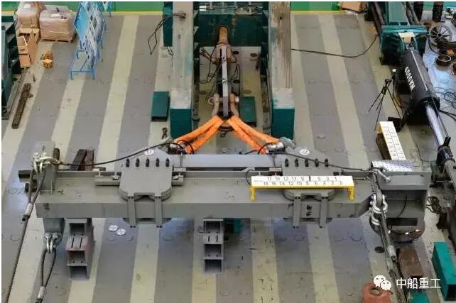 該吊具重達(dá)35噸,外形復(fù)雜,且客戶要求在吊具加載過程中實時改變整套試驗系統(tǒng)的受力狀態(tài),這對試驗的實施是一個重大挑戰(zhàn)。七二所打破傳統(tǒng)模式,結(jié)合現(xiàn)有試驗設(shè)施,設(shè)計加工了隨動連接裝置、吊具翻轉(zhuǎn)裝置、吊具緊固裝置及橫向移動降摩擦裝置等工裝,建立了滿足吊具智能調(diào)節(jié)的功能試驗方法,成功解決了吊具智能調(diào)節(jié)考核技術(shù)的難題,圓滿完成試驗,得到客戶的一致好評。
