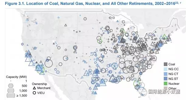 首先,到底是哪些、什么樣的煤電廠關(guān)閉了呢?研究報(bào)告指出,2002年到2016年間美國(guó)共有531座煤電廠關(guān)閉(大約59吉瓦),特別是2015年在各種退役的電廠中有80%是煤電廠。已經(jīng)關(guān)閉的以及預(yù)計(jì)關(guān)閉的煤電廠有以下特點(diǎn):