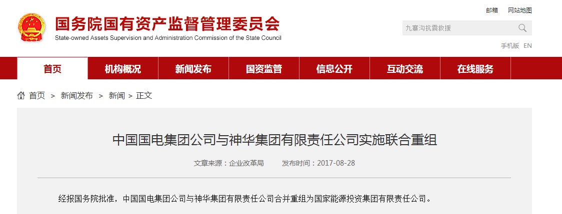 2017年8月28日,據(jù)國(guó)務(wù)院國(guó)有資產(chǎn)監(jiān)督管理委員會(huì)官網(wǎng)公布,經(jīng)報(bào)國(guó)務(wù)院批準(zhǔn),中國(guó)國(guó)電集團(tuán)公司與神華集團(tuán)有限責(zé)任公司合并重組為國(guó)家能源投資集團(tuán)有限責(zé)任公司。