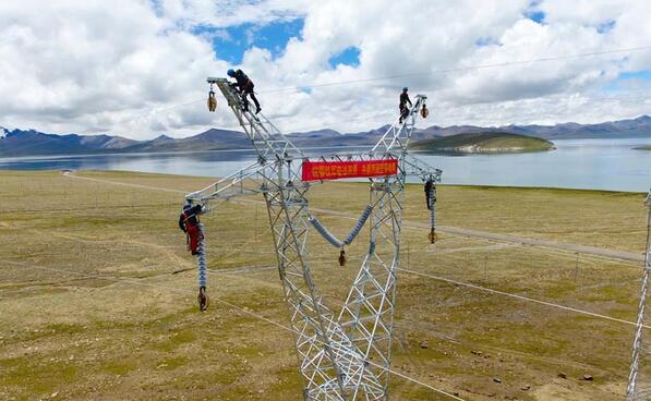2017年8月27日,在海拔5200多米高的西藏自治區(qū)山南市浪卡子縣打隆鎮(zhèn)境內(nèi),國(guó)網(wǎng)安徽省電力公司和湖北省送變電工程公司施工人員正在進(jìn)行放線作業(yè)。當(dāng)日,海拔5200多米高的110千伏洛扎II回輸變電工程浪卡子標(biāo)段輸電線完成施放,為確保今年9月30日并網(wǎng)送電奠定了基礎(chǔ)。