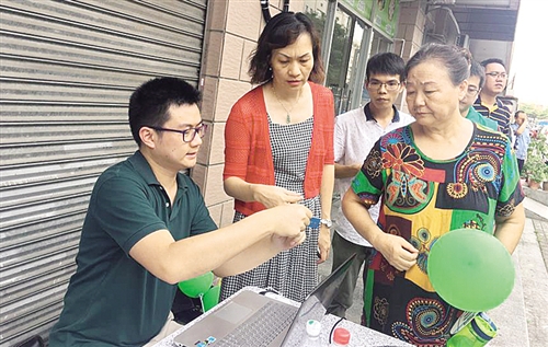 社區(qū)居民體驗社區(qū)智能垃圾回收房。