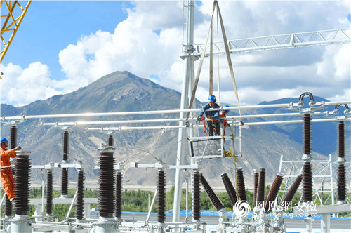 2017年8月30日,在西藏自治區(qū)山南市扎囊縣,國網(wǎng)安徽省電力公司援建工人正在安裝主變壓器接線。當日,西藏自治區(qū)山南市扎囊縣110千伏變電站已基本竣工,土建和電氣施工班組作業(yè)在做最后沖刺,這也是該縣首座110千伏變電站,并建設在海拔3540米上