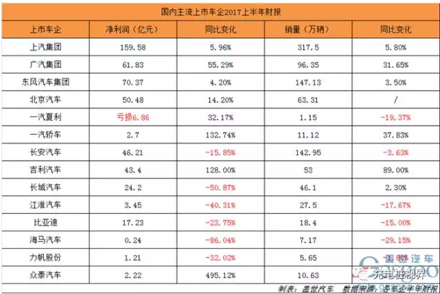 導(dǎo)讀: 從陸續(xù)發(fā)布的一版版財(cái)報(bào)中,我們看到有人賺得盆滿缽滿,有人通過玩轉(zhuǎn)資本秒秒鐘將利潤翻上幾番,更有一大批人辛苦忙活大半年落得個(gè)賠本賺吆喝的買賣……眾車企中,到底誰家歡喜誰家愁呢?上汽集團(tuán):依舊最壕 半年凈賺160億元8月29日,上汽集團(tuán)發(fā)布2017年半年報(bào)。財(cái)報(bào)披露,今年上半年,集團(tuán)實(shí)現(xiàn)營業(yè)總收入3964.06億元,同比增長12.85%;凈利潤同比增長5.96%至159.58億元,報(bào)告顯示,今年上半年,上汽集團(tuán)實(shí)現(xiàn)整車銷售 317.5萬輛,同比增長5.8%,國內(nèi)市場占有