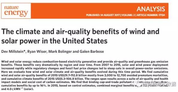綜上表所述,2007年至2015年間,美國因光伏、風電的發(fā)電量減少二氧化硫排放100萬噸、氮氧化物60萬噸、PM2.55萬噸。伯克利實驗室估計,相應地空氣改善使得7000人避免了過早死亡,相當于節(jié)省了560億美元的公共健康開支。此外,這期間因光伏、風電避免的二氧化碳排放相當于320億美元。2015年,美國風電的空氣質(zhì)量和氣候平均收益相當于7.3美分/千瓦時,而光伏的收益為4.0美分/千瓦時。上述數(shù)字為全美的平均值,各地具體收益有所不同,特別是中大西洋地區(qū)的風電收益高達14.3美分/千瓦時,而加利福尼亞風電收益僅有2.5美分/千瓦時。