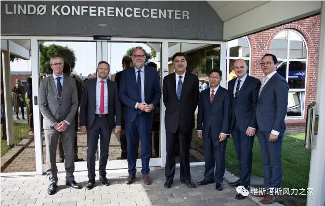 會見和參觀前,努爾˙白克力(右四)與丹麥能源、公用事業(yè)和氣候大臣利勒霍特(右五)、維斯塔斯中國總裁楊錁寶(右三)、維斯塔斯集團高級副總裁 Morten Dyrholm(右二)等合影。