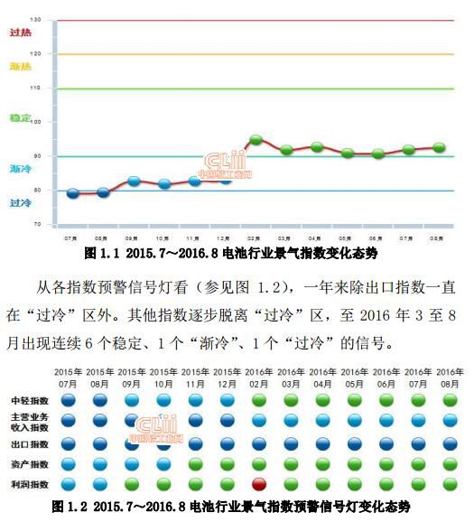 2015年3月至8月中輕電池景氣指數(shù)連續(xù)6個(gè)月在“過(guò)冷”區(qū)運(yùn)行,9月至12月在“漸冷”區(qū)運(yùn)行,2016年2月起在電池利潤(rùn)、資產(chǎn)指數(shù)增長(zhǎng)的影響下,中輕電池景氣指數(shù)上升至“穩(wěn)定”區(qū)。2016年8月中輕電池景氣指數(shù)為92.59 ,與7月91.94相比上漲0.65個(gè)百分點(diǎn)。