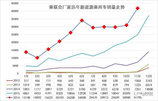 16年3-6月的持續(xù)拉升走勢暫停,7-10月進(jìn)入穩(wěn)定期,11月進(jìn)入年末拉升期。隨著新能源車政策調(diào)整,3季度乘用車市場處于整固期,增速不斷放緩,11月市場逐步恢復(fù)。11月的新能源車銷量41795臺,同比15年11月的24814臺增長68%,增速高于9月的65%和10月的52%。