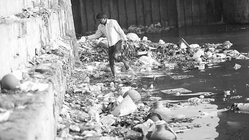 一名工人在印度亞穆納河收集垃圾。圖片來源:ertyo5/iStockphoto