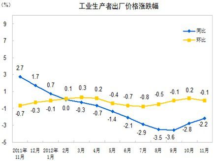 2012年11月份,全國(guó)工業(yè)生產(chǎn)者出廠價(jià)格同比下降2.2%,環(huán)比下降0.1%。工業(yè)生產(chǎn)者購進(jìn)價(jià)格同比下降2.8%,環(huán)比下降0.2%