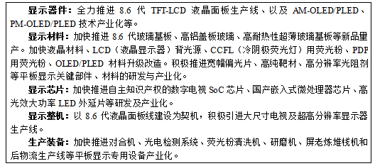 積極引進(jìn)先進(jìn)工藝技術(shù),加快建設(shè)8.6代TFT-LCD(薄膜晶體管液晶顯示器)生產(chǎn)線,搶占4K/8K超高清大屏幕電視、大尺寸IGZO(銦鎵鋅氧化物)面板等產(chǎn)業(yè)高地。加快推進(jìn)AM-OLED/PLED、PM-OLED/PLED技術(shù)產(chǎn)業(yè)化,力爭在OLED領(lǐng)域占有一席之地。圍繞TFT-LCD產(chǎn)業(yè)鏈,重點(diǎn)發(fā)展高端平板電腦、筆記本電腦、大尺寸電視及超高分辨率顯示器等高端顯示產(chǎn)品,不斷拓展在消費(fèi)電子、醫(yī)療教育、國防軍工等領(lǐng)域的應(yīng)用,培育壯大顯示終端應(yīng)用產(chǎn)品產(chǎn)業(yè)。積極發(fā)展液晶、玻璃基板、背光模組、彩色濾光鏡片、偏光片、驅(qū)動(dòng)IC玻璃、各類薄膜等產(chǎn)品,強(qiáng)化顯示面板上下游產(chǎn)業(yè)配套能力,延伸完善顯示生產(chǎn)設(shè)備、材料、元器件、面板制造、模塊組裝、相關(guān)器件制造等產(chǎn)業(yè)鏈關(guān)鍵環(huán)節(jié)。
