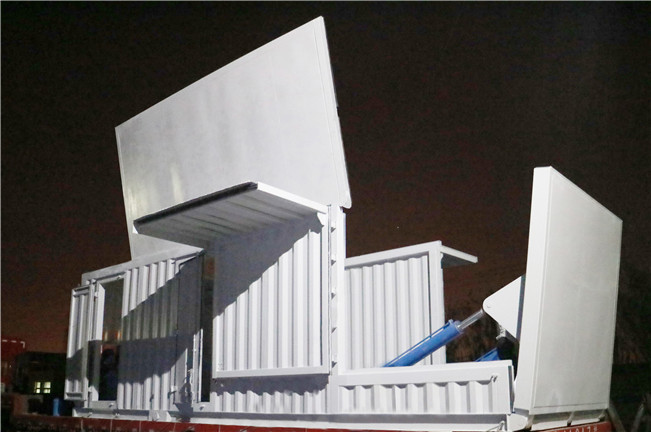 這臺設(shè)備箱總長10米,高2米8、寬2米8.左側(cè)有兩個單扇側(cè)門,右面與左面對應(yīng)位置也有兩個單扇側(cè)門,兩個門之間特有內(nèi)部設(shè)備名稱和公司廣告標(biāo)語,讓這個特種箱變得“生動”、變得“熟悉”。集裝箱前端設(shè)有可折疊腳梯,精小卻很實用、不占空間、不增總重。腳梯旁邊設(shè)有總控制翼開關(guān),以下便是這臺特種集裝箱的亮點,與開關(guān)對應(yīng)的另一端,即后端,采用優(yōu)質(zhì)鋼材打造的一扇“隱形”門,內(nèi)部有超大的液壓控制系統(tǒng)和超大的合頁鏈接,可獨立控制這個“隱形”門的閉合與展開。極大的方便內(nèi)部設(shè)備的安裝和拆卸。集裝箱的頂部也是由液壓控制系統(tǒng)操控,輕松操作腳梯旁邊的控制器即可完成頂部的開啟與閉合,它就像一臺敞篷豪車,時尚、獨特、讓人不發(fā)拒絕。頂部與后端連接處還有一個獨特之處,即兩個對開的“隱形”側(cè)門。閉合的狀態(tài)下它只是一個多半個側(cè)面高度和半個頂部寬度所組成的一個“7字形”。而當(dāng)開啟控制開關(guān)后,兩個“7”字形背靠背貼在兩個側(cè)面箱體上,兩扇“隱形”門就像即將長出來的翅膀,感覺萌萌的。
