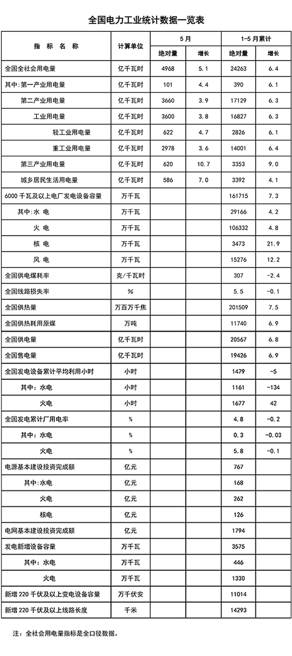 6月16日,國家能源局發(fā)布1-5月份全國電力工業(yè)統(tǒng)計(jì)數(shù)據(jù)。其中包含全國全社會(huì)用電量、第一產(chǎn)業(yè)用電量、第二產(chǎn)業(yè)用電量,工業(yè)用電量等