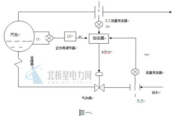 設(shè)計(jì)K2I2 =K3I3此時(shí)I0正是調(diào)節(jié)閥處于正常開度時(shí)所需的電流信號。假定在某一時(shí)刻,蒸汽負(fù)荷突然增加,蒸汽流量變送器的輸出電流I2相應(yīng)增加,加法器的輸出電流I0就減少,從而開大給水調(diào)節(jié)閥。與此同時(shí)出現(xiàn)了虛假液位現(xiàn)象。液位調(diào)節(jié)器輸出電流I1將增大。由于進(jìn)入加法器的兩個(gè)信號相反,蒸汽流量變送器的輸出電流I1 會(huì)抵消一部分假液位輸出電流I2 ,所以虛假液位所帶來的影響將局部或全部被克服。