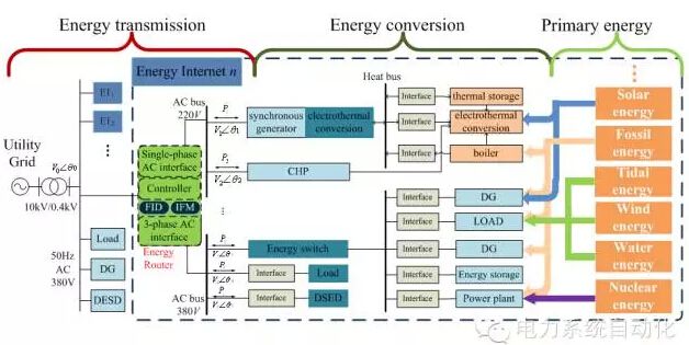 由于電能的轉(zhuǎn)換效率、傳輸速度及效率等優(yōu)勢(shì), 使之成為能源互聯(lián)網(wǎng)最為有效的能源轉(zhuǎn)換中轉(zhuǎn)和傳輸媒介。能源互聯(lián)網(wǎng)的基本架構(gòu)及關(guān)鍵設(shè)備如圖1所示: