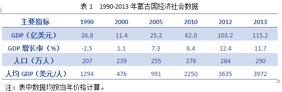 蒙古北與俄羅斯,東、南、西與中國接壤,中蒙兩國邊界線長達(dá)4710公里,國土面積156.65萬平方公里,居世界第17位。截至2013年底,蒙古國人口290萬人,48.3%為男性,51.7%為女性,是世界上人口密度最低的國家之一,僅為1.8人/平方公里。2013年蒙古國國內(nèi)生產(chǎn)總值115.2億美元,同比增長11.7%,第一、二、三產(chǎn)占GDP的比重分別為15.8%、32.6%、51.6%。1990-2013年蒙古國經(jīng)濟(jì)社會數(shù)據(jù)如下表所示。