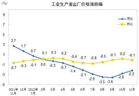 2012年11月份,全國(guó)工業(yè)生產(chǎn)者出廠價(jià)格同比下降2.2%,環(huán)比下降0.1%。工業(yè)生產(chǎn)者購(gòu)進(jìn)價(jià)格同比下降2.8%,環(huán)比下降0.2%