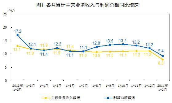 1-2月份,規(guī)模以上工業(yè)企業(yè)實現(xiàn)主營業(yè)務(wù)收入147582.7億元,同比增長8%,主營業(yè)務(wù)成本125711.2億元,增長8.9%。