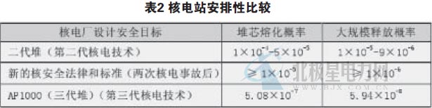 核電站安全目標(biāo)有兩個(gè)指標(biāo),一是反應(yīng)堆堆芯熔化率(簡稱堆熔概率),二是大規(guī)模釋放放射性物質(zhì)的概率(簡稱釋放概率)。如果以每核反應(yīng)堆每年來計(jì)算的話,二代堆的堆熔概率為10-4,也就是每堆每年出現(xiàn)萬分之一的可能性;而釋放概率為10-5,也就是每堆每年有10萬分之一的可能會(huì)發(fā)生核物質(zhì)大規(guī)模釋放。第三代核電機(jī)組要有更高安全目標(biāo)。即堆芯熱工安全裕量>l5%,堆芯損壞概率<10-5/堆年,大量放射性外泄<10-6/堆年。兩次核電事故后,法規(guī)和標(biāo)準(zhǔn)對安全目標(biāo)的要求又提高了,而AP1000的安全目標(biāo)比前兩者更高,具體見附表2。