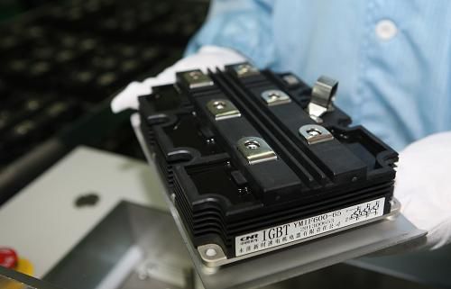 中國(guó)北車(chē)技術(shù)人員展示裝有IGBT芯片的IGBT模塊