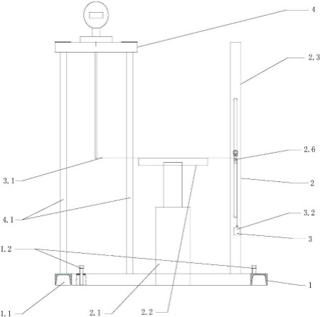 本實(shí)用新型的目的是由以下技術(shù)方案實(shí)現(xiàn)的:一種插入式靶式流量計(jì)的離線校驗(yàn)裝置,其特征在于:一支撐機(jī)構(gòu)、安裝在支撐機(jī)構(gòu)上的調(diào)平機(jī)構(gòu)、配重機(jī)構(gòu)、安裝機(jī)構(gòu),其中,支撐機(jī)構(gòu)包括:一機(jī)座、安裝在機(jī)座上的機(jī)座調(diào)平螺桿;調(diào)平機(jī)構(gòu)包括:垂直安裝在機(jī)座上的調(diào)平支架、設(shè)置在機(jī)座上的千斤頂、安裝在千斤頂上的水平參考平板,其中,調(diào)平支架上安裝有一調(diào)平螺桿,調(diào)平螺桿的一端鎖緊在調(diào)平支架上,調(diào)平螺桿的另一端定位有一定滑輪;配重機(jī)構(gòu)設(shè)有:軟鋼絲,軟鋼絲的一端與插入式靶式流量計(jì)的靶桿相連,另一端穿過定滑輪與配重箱連接;安裝機(jī)構(gòu)包括:垂直安裝在機(jī)座的支柱,安裝在支柱上的安裝臺(tái)、鑲嵌在安裝臺(tái)上的鋼板尺。