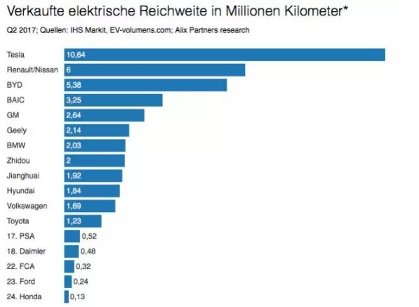 這種擔憂其實由來已久,AlixPartners公司之前搞了一個電動里程榜單,就是按照電動汽車銷量乘以行駛里程得出的排行榜,二季度榜單中前十名就有五家中國企業(yè),剩下的美國占了特斯拉和通用兩家,韓國有現(xiàn)代,歐洲只有寶馬和半個雷諾(雷諾日產(chǎn)是一個大聯(lián)盟)。