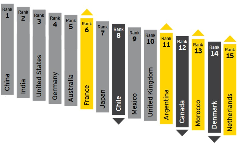 根據(jù)安永的可再生能源國家吸引力指數(shù)報告(RECAI),前三位排名依舊無變化,中國仍是第一,印度和美國分居二、三位。