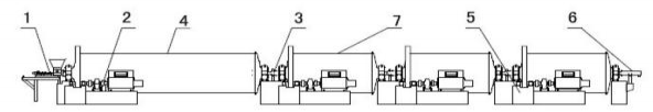 1、獨立給料機 2、高壓電機齒輪傳動系統(tǒng) 3、串聯(lián)加球裝置 4、串聯(lián)式連續(xù)球磨機的一級球磨罐 5、基礎(chǔ) 6、提流出料裝置 7、串聯(lián)式連續(xù)球磨機的二級球磨罐。