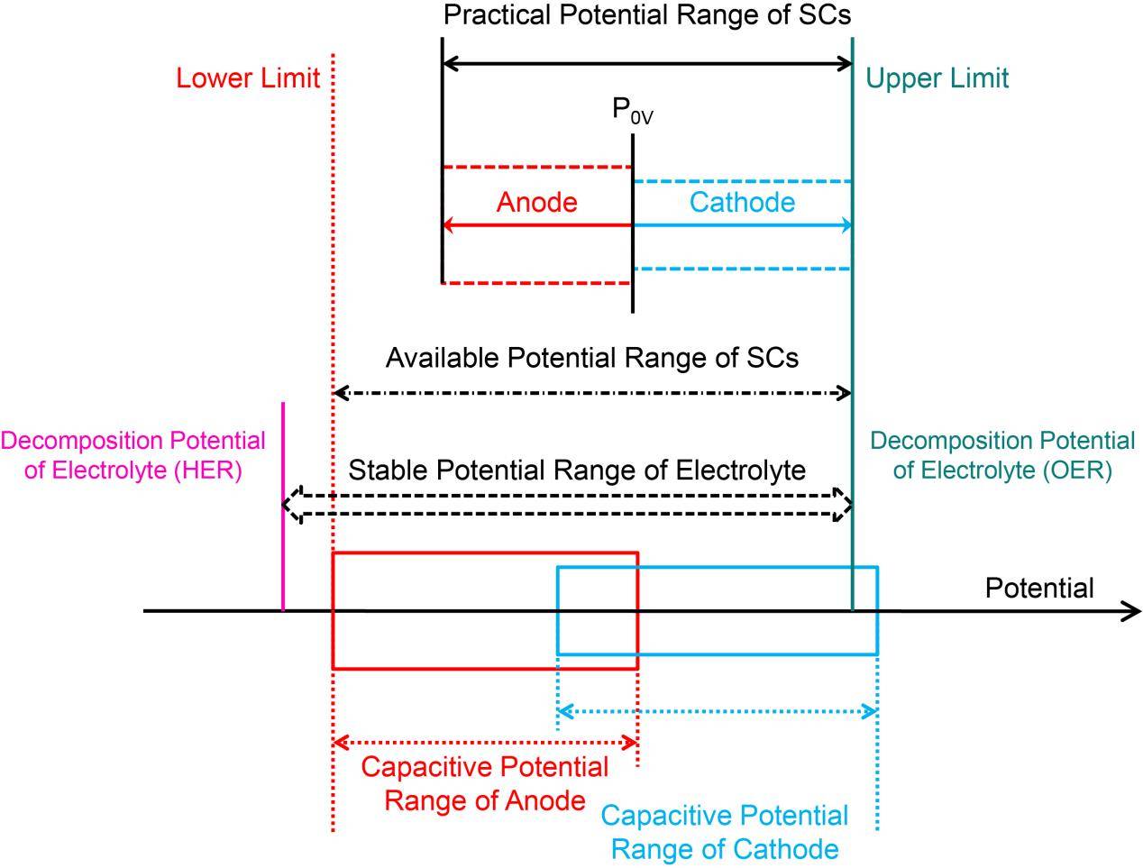 上圖展示了電容器電極實際電位變化(Practical Potential Range of SCs)、電容器電極理論可用電位區(qū)間(Available Potential Range of SCs)與電極表現(xiàn)電容性質(zhì)的電位范圍(Capacitive Potential Range)以及電解質(zhì)穩(wěn)定電位范圍(Stable Potential Range of Electrolyte)的關(guān)系。