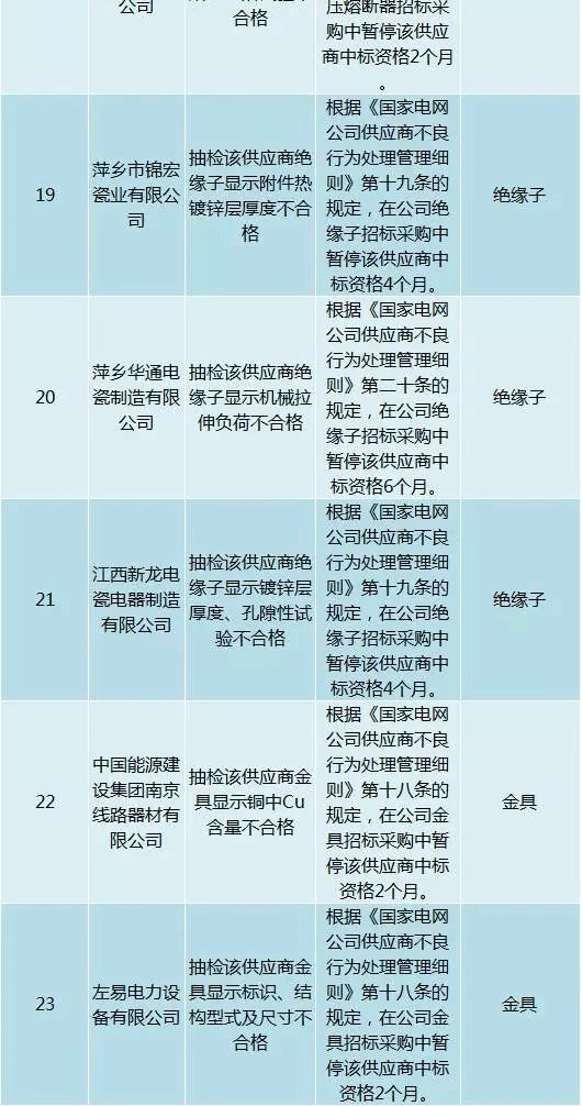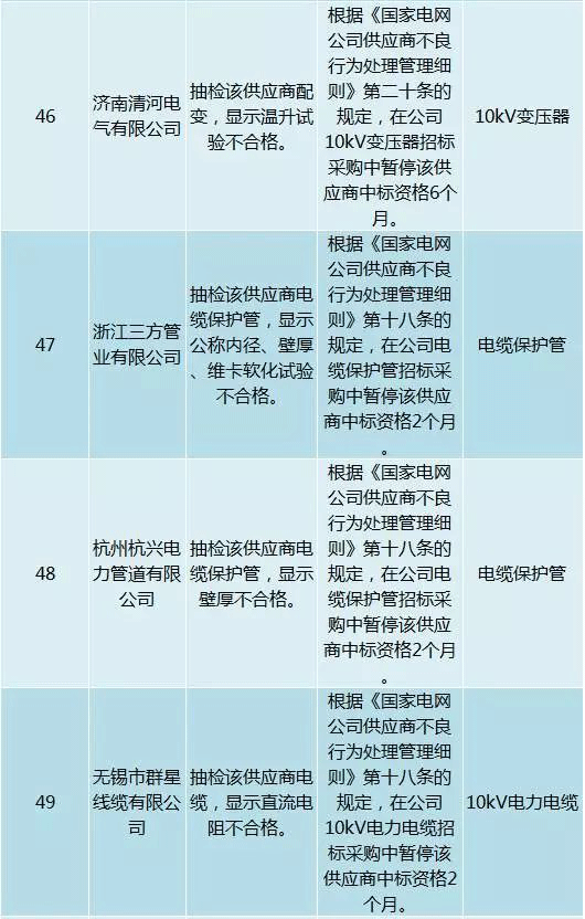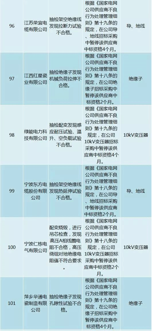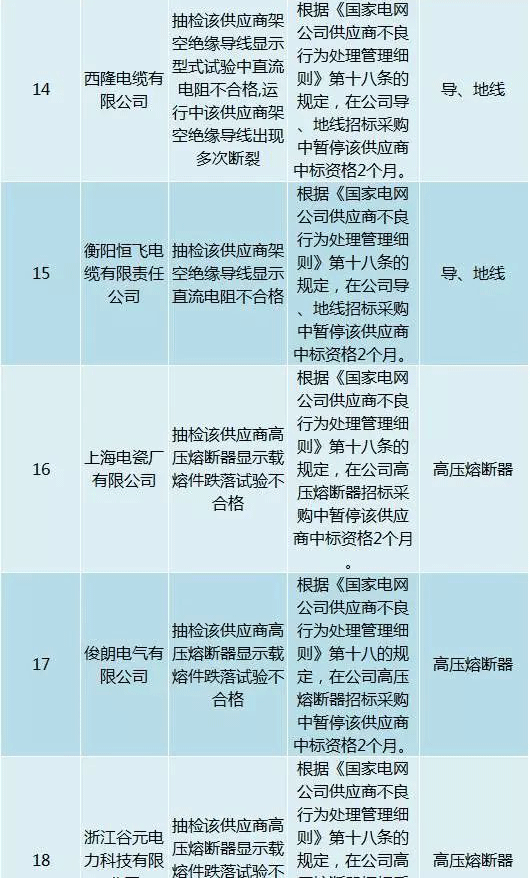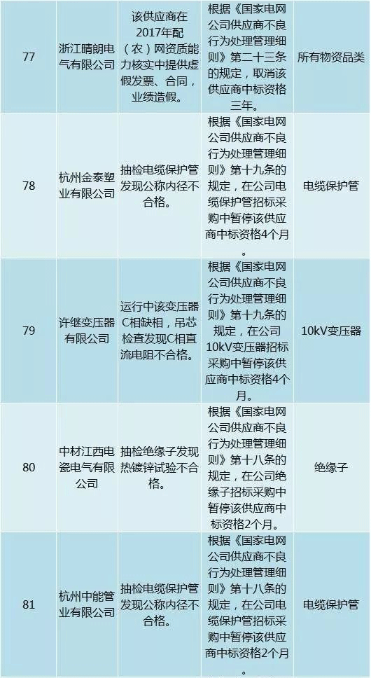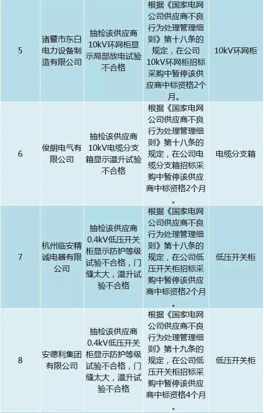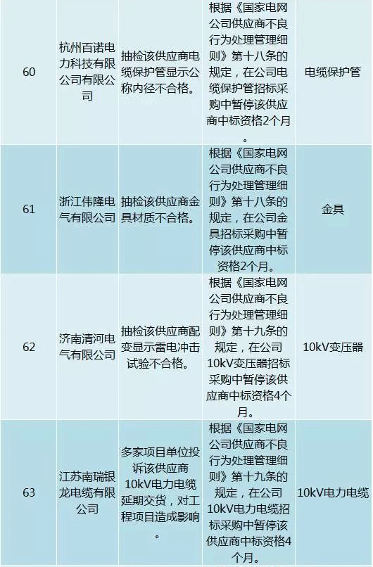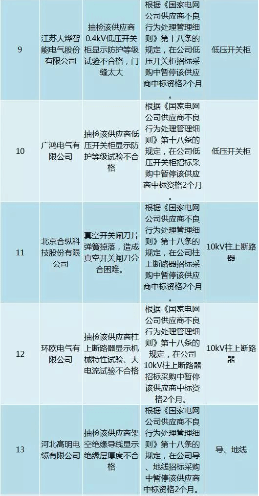 為促進供應(yīng)商誠信履約,保證產(chǎn)品質(zhì)量,確保電網(wǎng)建設(shè)順利進行及安全可靠供電,依據(jù)《國家電網(wǎng)公司供應(yīng)商不良行為處理管理細則》(以下簡稱《細則》)的有關(guān)規(guī)定,對出現(xiàn)重大產(chǎn)品質(zhì)量問題、履約不誠信等問題的供應(yīng)商進行了處理。本次處理涉及10kv變壓器、高壓熔斷器等物資,具體處理情況如下: