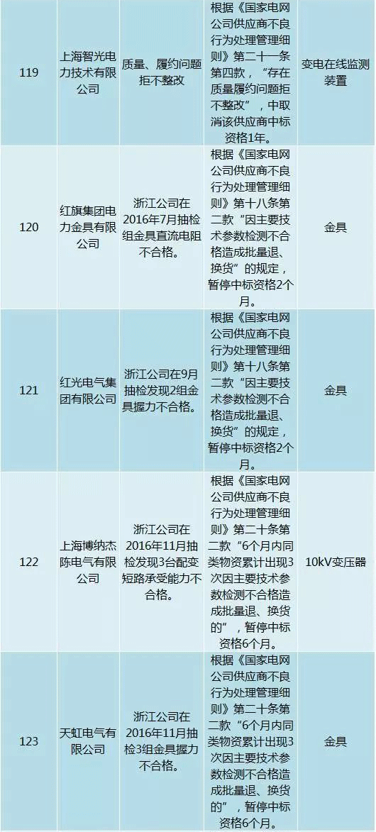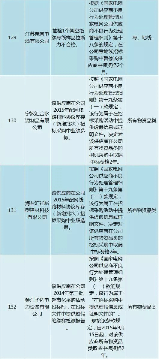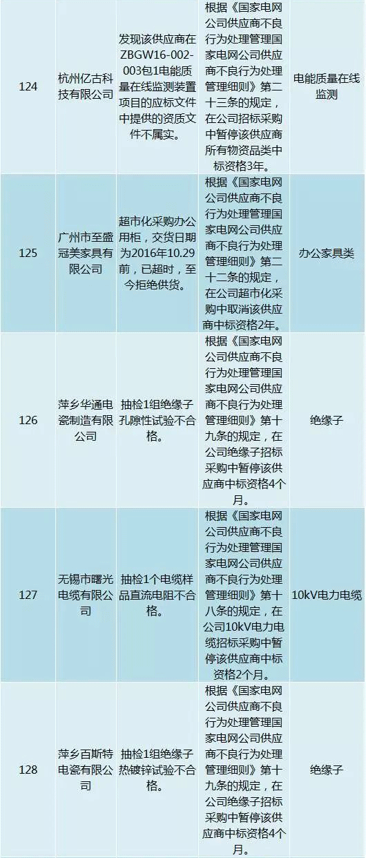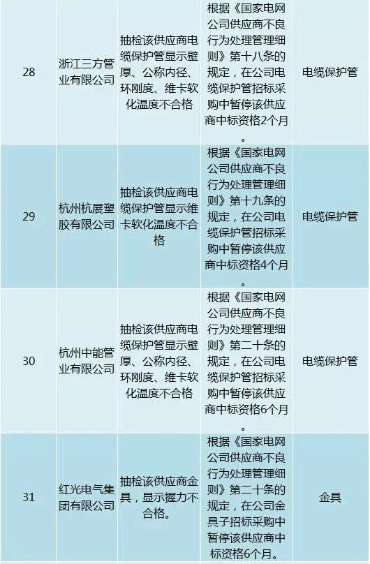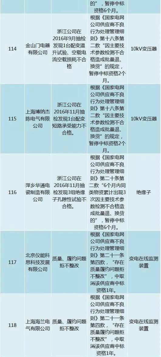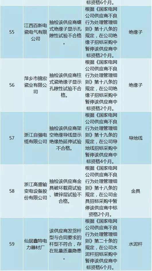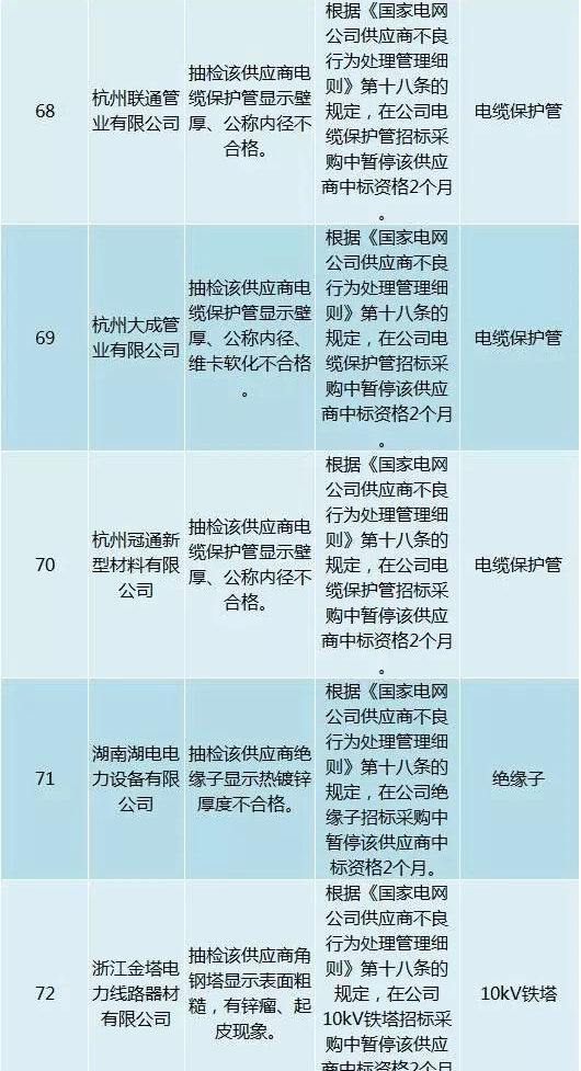 為促進供應(yīng)商誠信履約,保證產(chǎn)品質(zhì)量,確保電網(wǎng)建設(shè)順利進行及安全可靠供電,依據(jù)《國家電網(wǎng)公司供應(yīng)商不良行為處理管理細則》(以下簡稱《細則》)的有關(guān)規(guī)定,對出現(xiàn)重大產(chǎn)品質(zhì)量問題、履約不誠信等問題的供應(yīng)商進行了處理。本次處理涉及10kv變壓器、高壓熔斷器等物資,具體處理情況如下: