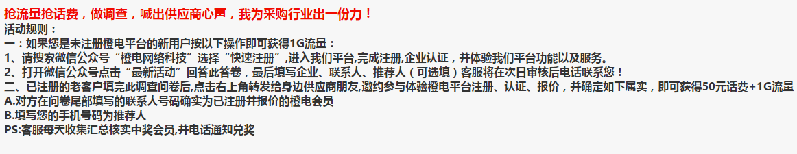 參與《橙電平臺(tái)供應(yīng)商調(diào)查問(wèn)卷》,搶1G流量+50元話費(fèi)。