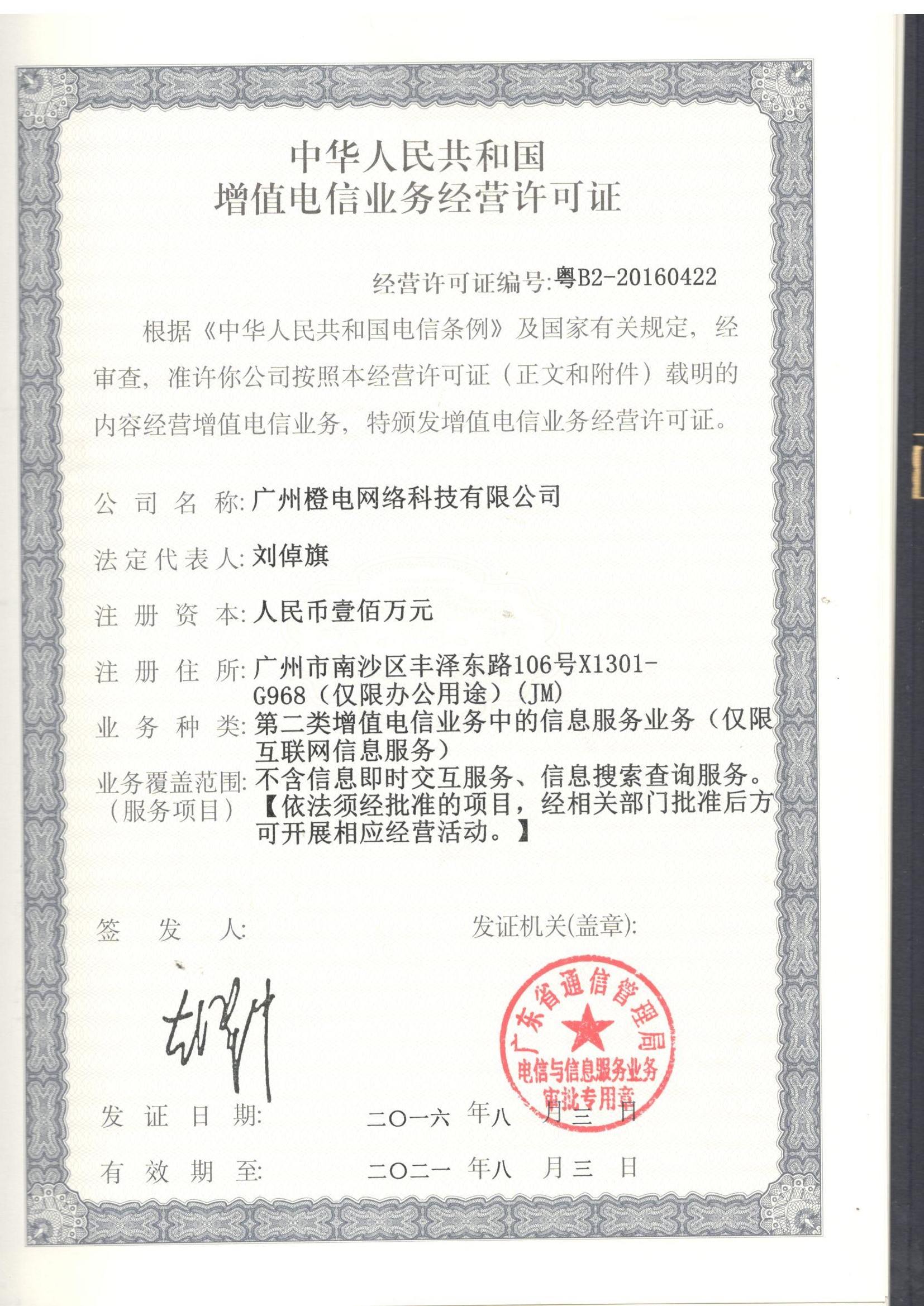 2016年8月3日,廣州橙電網(wǎng)絡(luò)科技有限公司宣布其正式獲得由廣東省通信管理局頒發(fā)的《中華人民共和國(guó)增值電信業(yè)務(wù)經(jīng)營(yíng)許可證》(編號(hào):粵B2—20160422)(簡(jiǎn)稱ICP許可證),獲準(zhǔn)經(jīng)營(yíng)第二類增值電信業(yè)務(wù)中的信息服務(wù)業(yè)務(wù)。