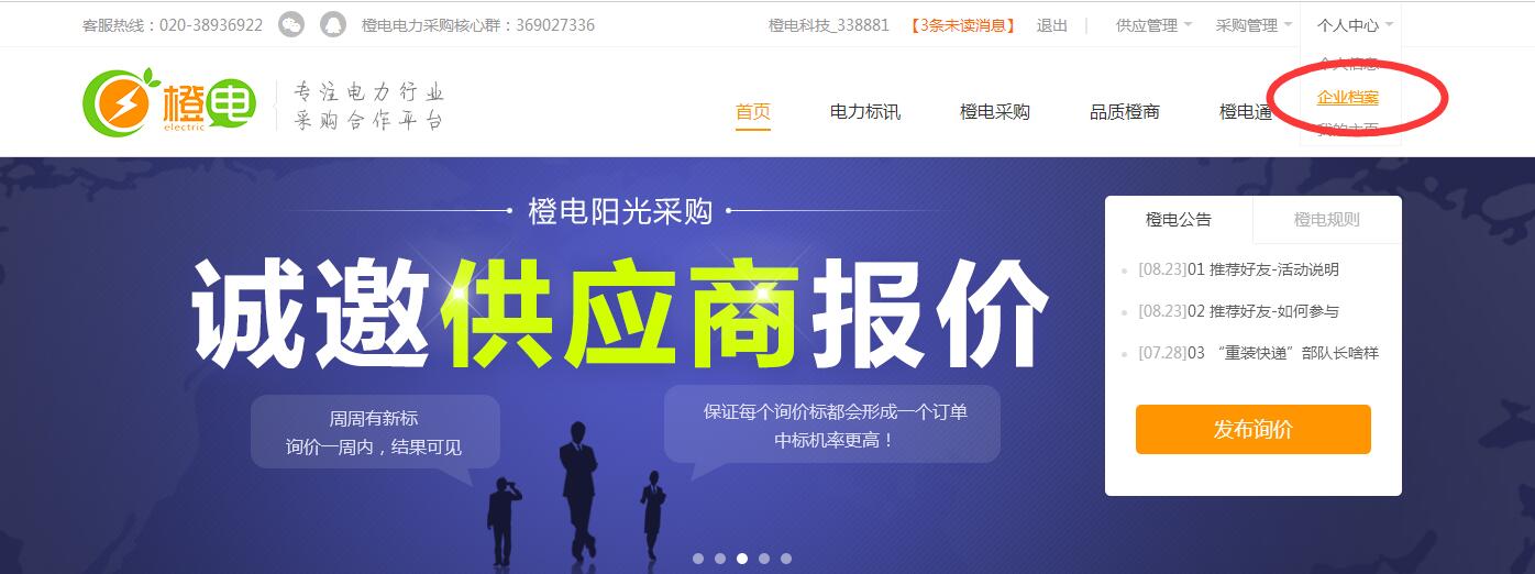 第一步:登陸橙電賬號(hào),點(diǎn)擊在網(wǎng)站右上角【個(gè)人中心】—【企業(yè)檔案】