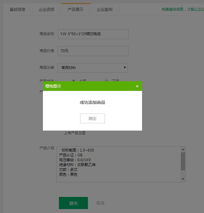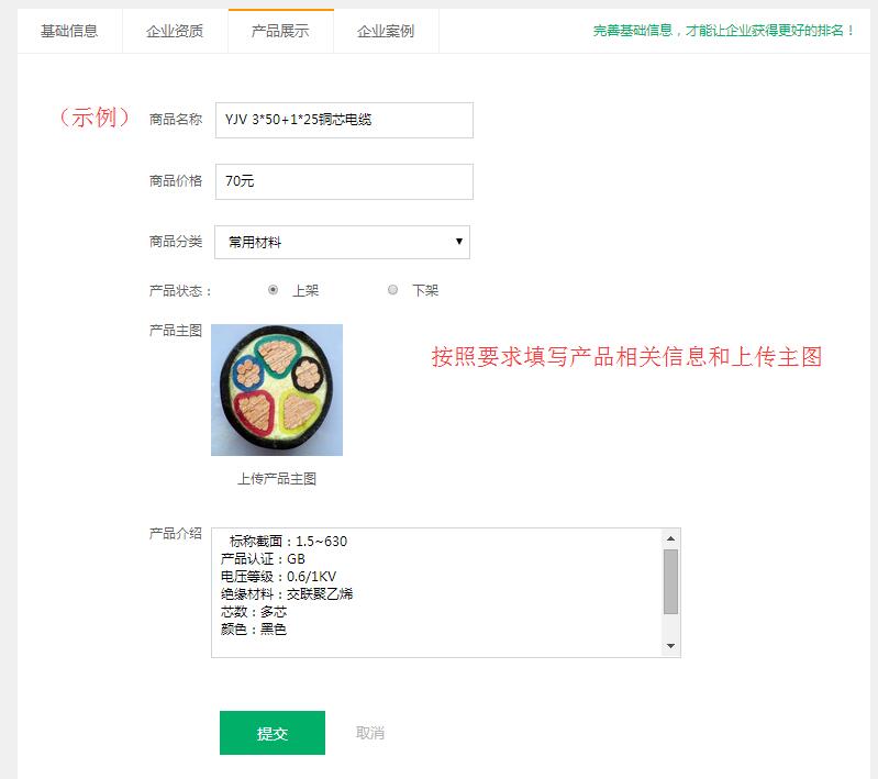 第三步:根據(jù)網(wǎng)站提醒填寫所需展示產(chǎn)品的信息和上傳產(chǎn)品主圖,然后點(diǎn)擊“提交”。