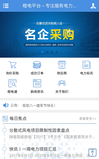 一、通過(guò)清晰明了的首頁(yè)入口,您能即時(shí)查閱電力行業(yè)的招標(biāo)采購(gòu)信息,并完成注冊(cè)、采購(gòu)詢(xún)價(jià)查詢(xún)、中標(biāo)查詢(xún)、企業(yè)資質(zhì)查詢(xún)、業(yè)內(nèi)精選新聞資訊等功能,一鍵直達(dá)你所關(guān)注的內(nèi)容!